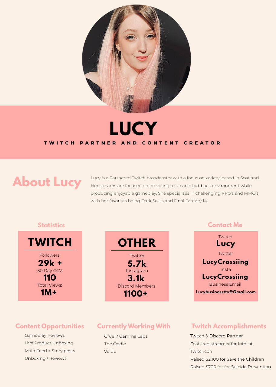Lucy is a Partnered Twitch broadcaster with a focus on variety, based in Scotland. Her streams are focused on providing a fun and laid-back environment while producing enjoyable gameplay. She specialises in challenging RPG’s and MMO’s,